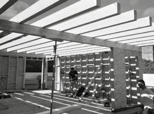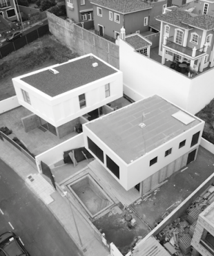 Fachada dual innovadora - Planta baja revestida en paneles Viroc, planta primera revocada en blanco